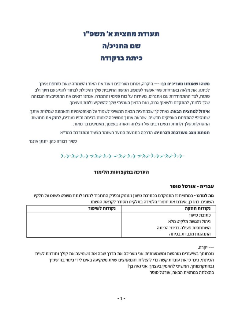 - הערכה בכל מקצוע: מה למדנו, נקודות חוזק, נקודות לשיפור והתייחסות אישית של המור